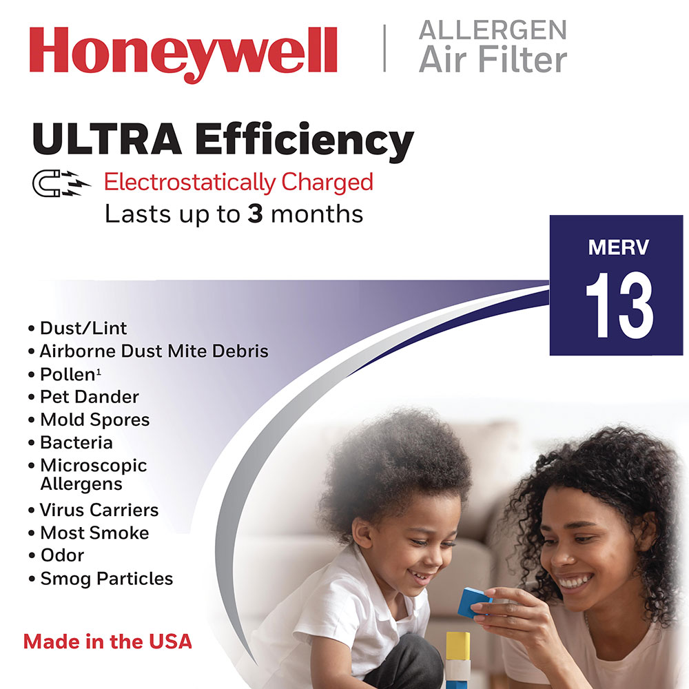 Capturing a high percentage of airborne particles and allergens, this selection of Honeywell Ultra Efficiency Allergen Air Filters features a MERV 13 Rating. Premium 1 in. air cleaning filters are electrostatically charged to capture and trap dust particles while remaining effective against a series of other contaminants. Showcasing durability and overall effectiveness, these air filters offer easy flow energy efficiency and a heavy duty frame. Honeywell Ultra Efficiency Allergen Air Filters each last up to 3 months. Please be certain to measure the filters you are replacing or your filter boot to make sure it's an exact match.