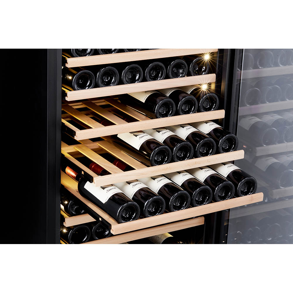 The Honeywell 174 Bottle Dual-Zone Compressor Wine Cooler is a premium storage solution designed for serious wine enthusiasts. Its elegant stainless steel glass door feature\ UV-resistant double-paned thermopane glass, safeguards your extensive collection from harmful light and maintains consistent temperatures. The electronic digital thermostat allows for precise temperature control, ranging from 40°F to 65°F, ensuring optimal conditions for a diverse range of wines, including sparkling whites. Soft interior LED lighting beautifully illuminates your collection, while 16 slide-out wooden shelves provide easy access to each bottle. Adjustable legs ensure stability on any surface.