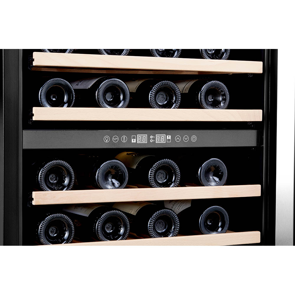 The Honeywell 46 Bottle Dual-Zone Compressor Wine Cooler is designed to provide optimal wine storage and display. It features a sleek stainless steel glass door with UV-resistant double-paned thermopane glass to protect your collection from harmful light and maintain consistent temperatures. The electronic digital thermostat allows precise temperature control between 40°F and 65°F, catering to a wide range of wines, while soft interior LED lighting elegantly showcases your bottles. Six slide-out wooden shelves provide easy access, and adjustable legs ensure stability on any surface.