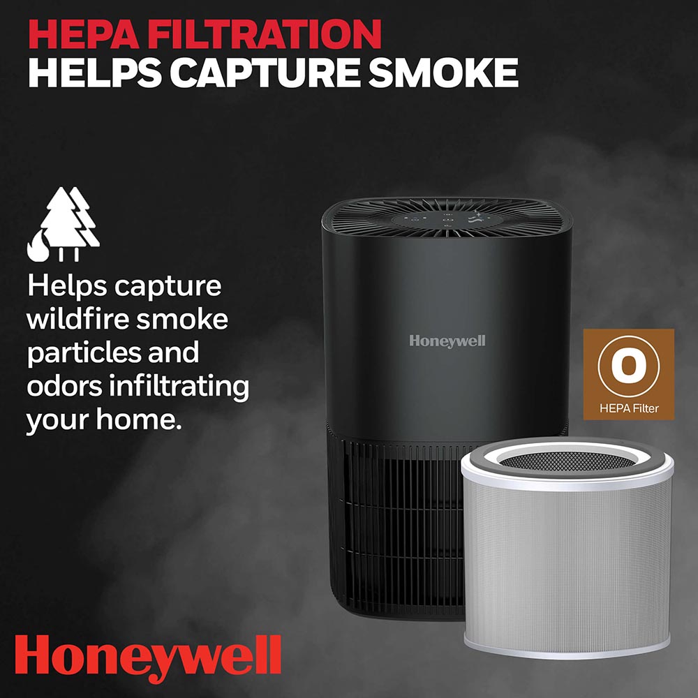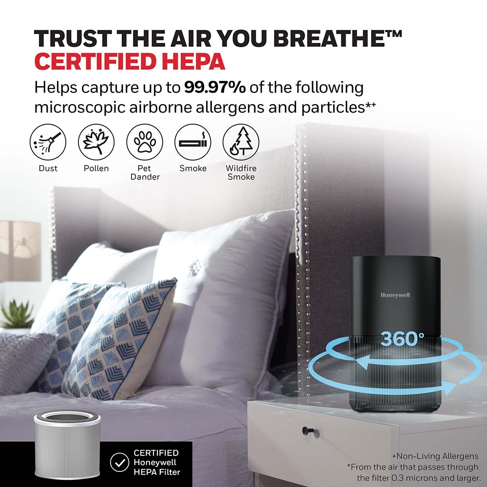 Bring cleaner air into your home with the Honeywell Compact Air Purifier, featuring a sleek design that fits easily onto any tabletop without taking up too much space. Ideal for personal areas, this air purifier is perfect for a baby’s nursery, bedroom, or small office. Equipped with powerful HEPA filtration, it's engineered to help capture up to 99.97% of microscopic airborne allergens and particles, including dust, pollen, pet dander, dust mite debris, and smoke.1 A dedicated Pre-Carbon filter works to reduce common household odors like cooking smells, paint fumes, VOCs (volatile organic compounds), and even wildfire smoke, ensuring the air you breathe is noticeably fresher.
