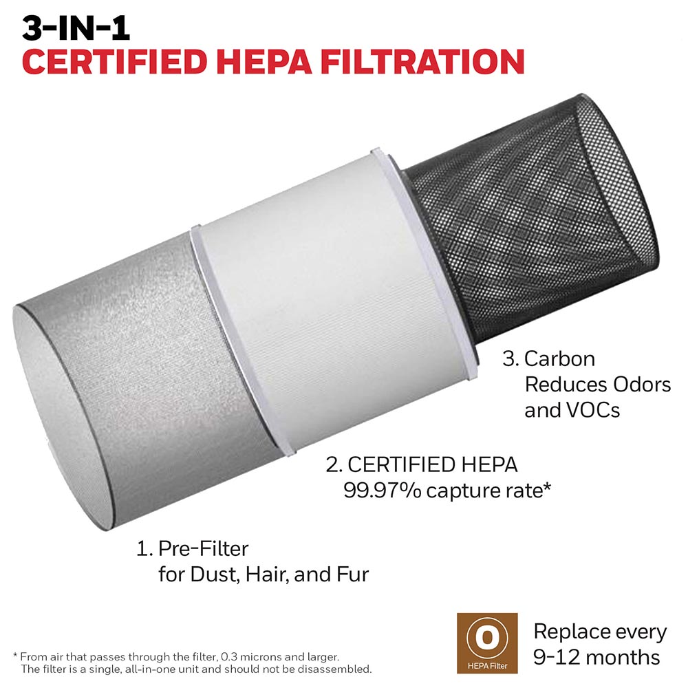 Filtration begins at the first level with a vacuumable Pre-Filter designed to capture larger airborne particles. Next, the certified HEPA Filter acts as the second level, capturing up to 99.97% of microscopic airborne allergens and particles, including dust, pollen, pet dander, dust mite debris, and smoke as small as 0.3 microns or larger, from the air that passes through. Finally, the third level uses an Activated Carbon Filter for effective odor reduction, ensuring the released air is clean and fresh. For optimal cleaning performance, replace your HEPA filter every 12 months. The filter check/reset light on the HPA120 Air Cleaner will remind you when it's time to change your filter. Initial filter included.