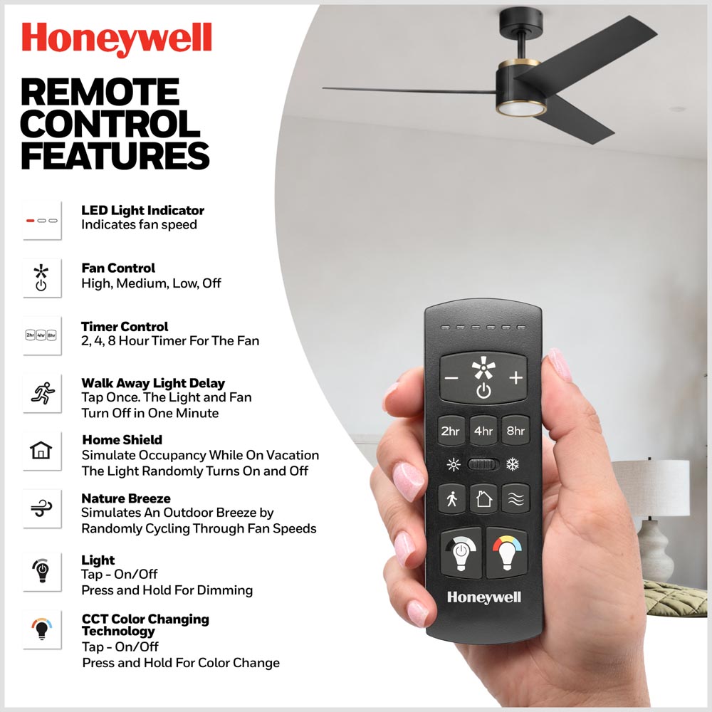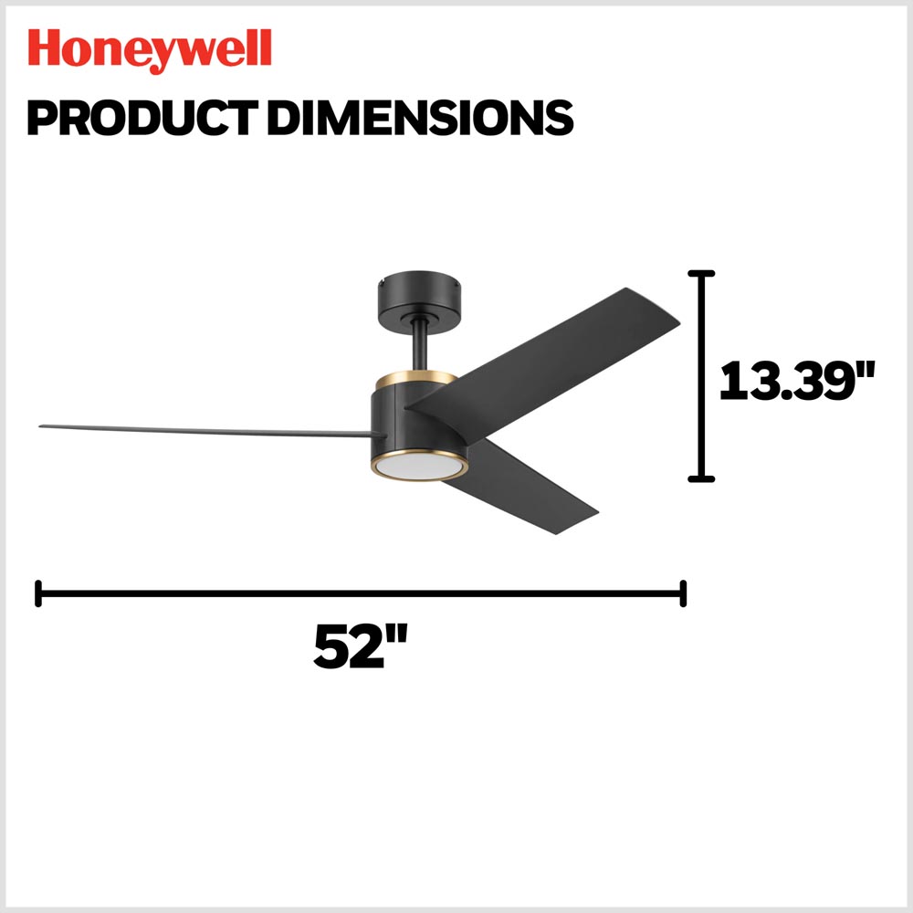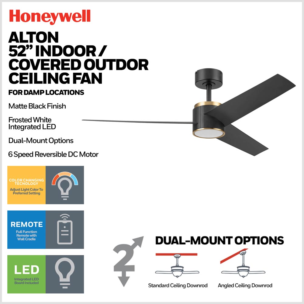 The Honeywell Altan 52-inch ceiling fan blends modern style with advanced performance for today’s living spaces. Finished in matte black with brushed gold accents, Altan offers a bold modern contrast that elevates contemporary and transitional spaces.