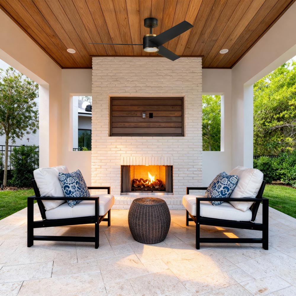 Damp rated with stainless steel hardware, Altan is ideal for bedrooms, living rooms, and covered outdoor patios. Dual-mount installation and the included remote control make setup and everyday operation simple and convenient.