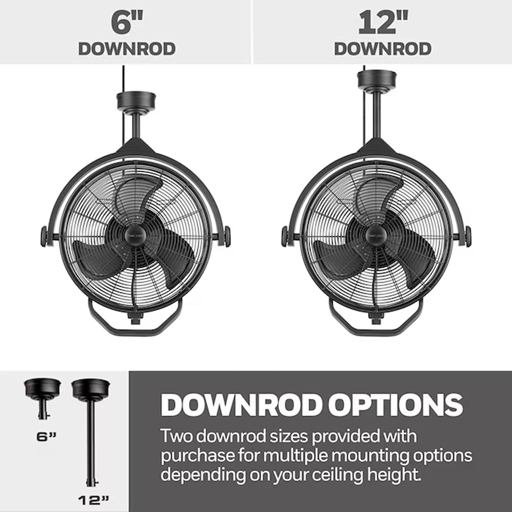 Designed for easy installation, it features a universal mounting bracket and standard 3-prong plug, eliminating the need for hardwiring and allowing flexible placement wherever you need circulation. Full 360-degree manual swivel action and vertical adjustment knobs give you complete control over airflow direction, while optional 6-inch and 12-inch downrods let you adjust the height to fit your space perfectly.