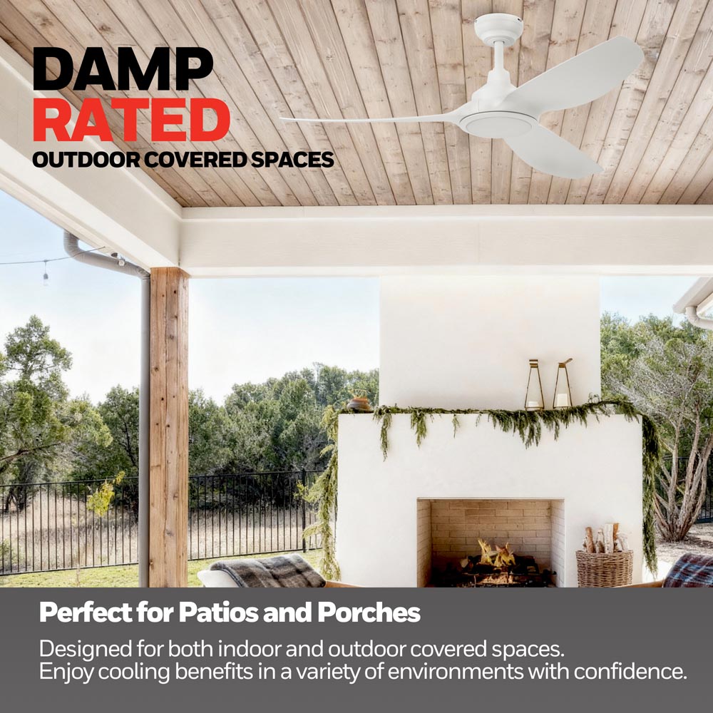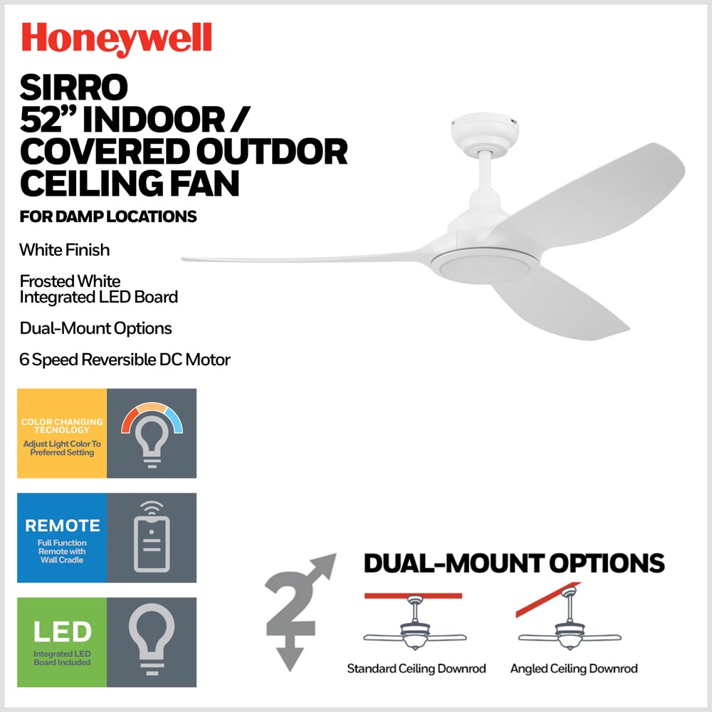 Honeywell Sirro Indoor or Covered Outdoor Ceiling Fan with Adjustable LED Light, 52-Inch, White - 53025-03