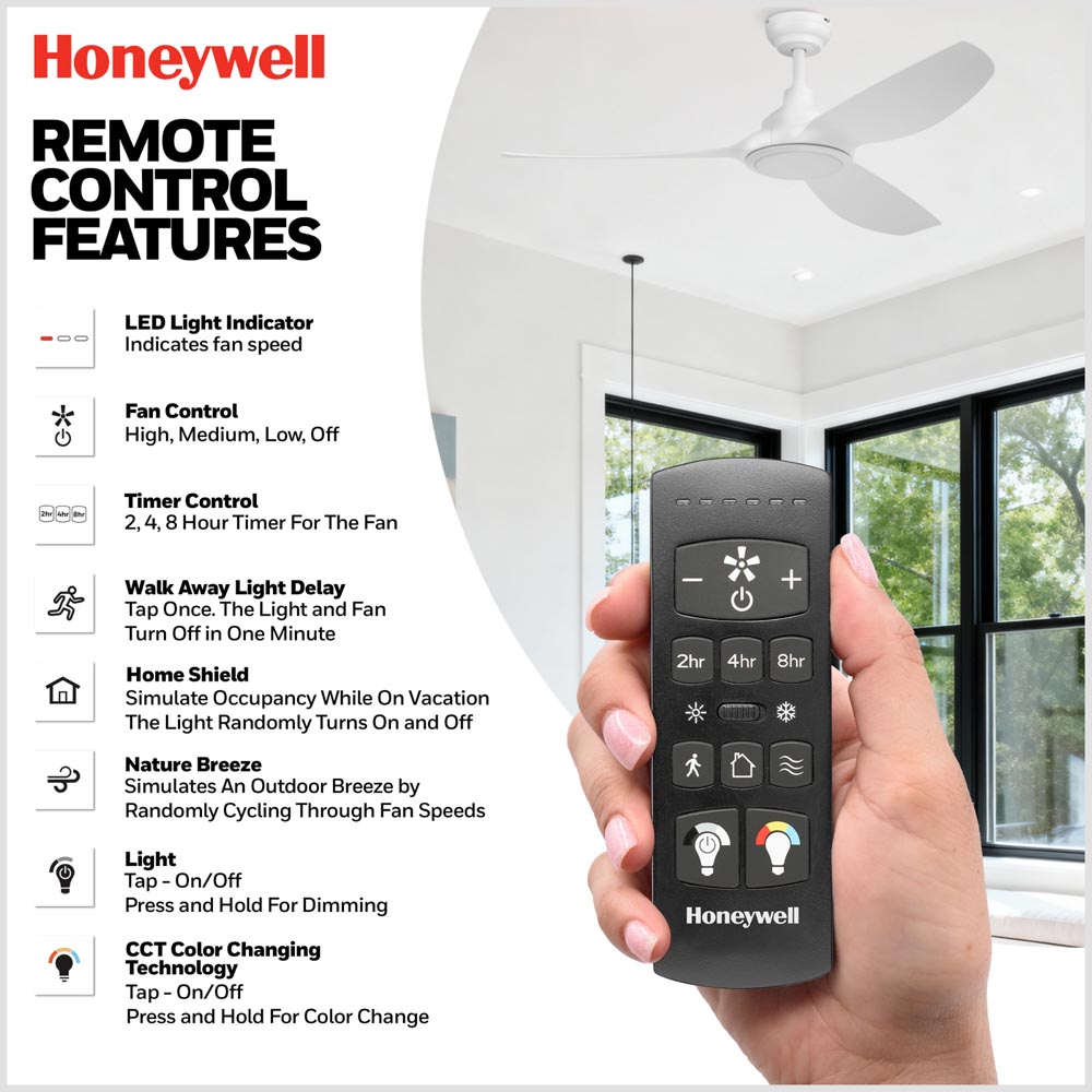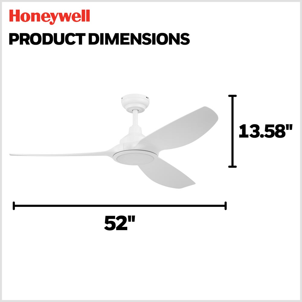 The Honeywell Sirro 52-inch ceiling fan delivers modern performance and everyday versatility for bedrooms, living rooms, and covered outdoor spaces. Designed with clean lines and a streamlined three-blade profile, Sirro blends contemporary style with advanced airflow technology.