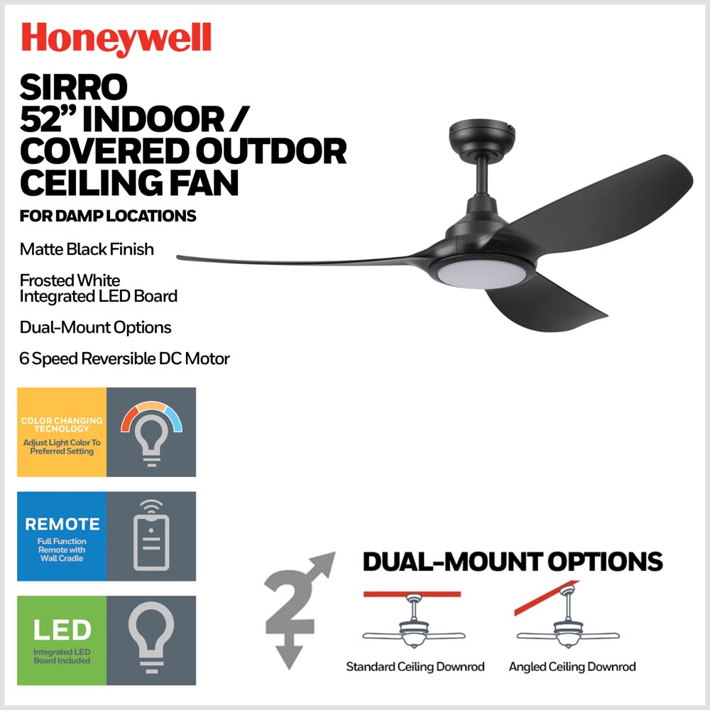 Honeywell Sirro Indoor or Covered Outdoor Ceiling Fan with Adjustable LED Light, 52-Inch, Matte Black - 53026-03
