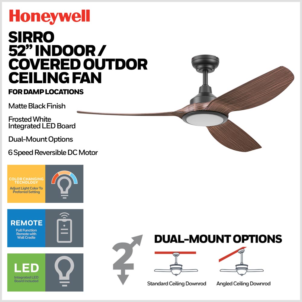 Damp rated for covered outdoor use and equipped with stainless steel hardware, Sirro is built for durability and long-term reliability. Dual-mount installation and the included remote control make setup and daily operation effortless. Whether installed indoors or on a covered patio, the Honeywell Sirro ceiling fan offers refined design, customizable lighting, and efficient performance in one complete solution.