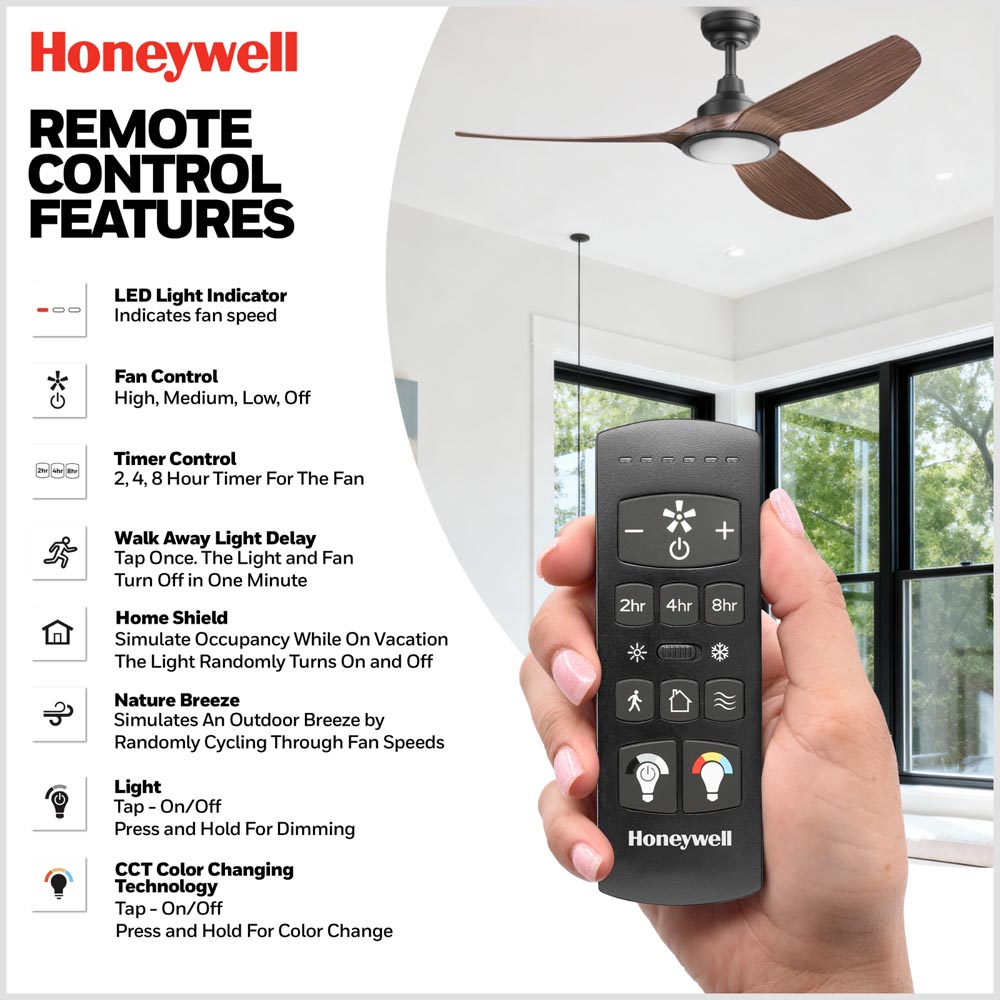 The Honeywell Sirro 52-inch ceiling fan delivers modern performance and everyday versatility for bedrooms, living rooms, and covered outdoor spaces. Designed with clean lines and a streamlined three-blade profile, Sirro blends contemporary style with advanced airflow technology.