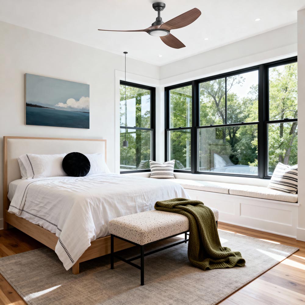 - The matte black housing paired with rich chocolate auburn blades adds warmth and contrast for transitional and farmhouse-inspired designs.