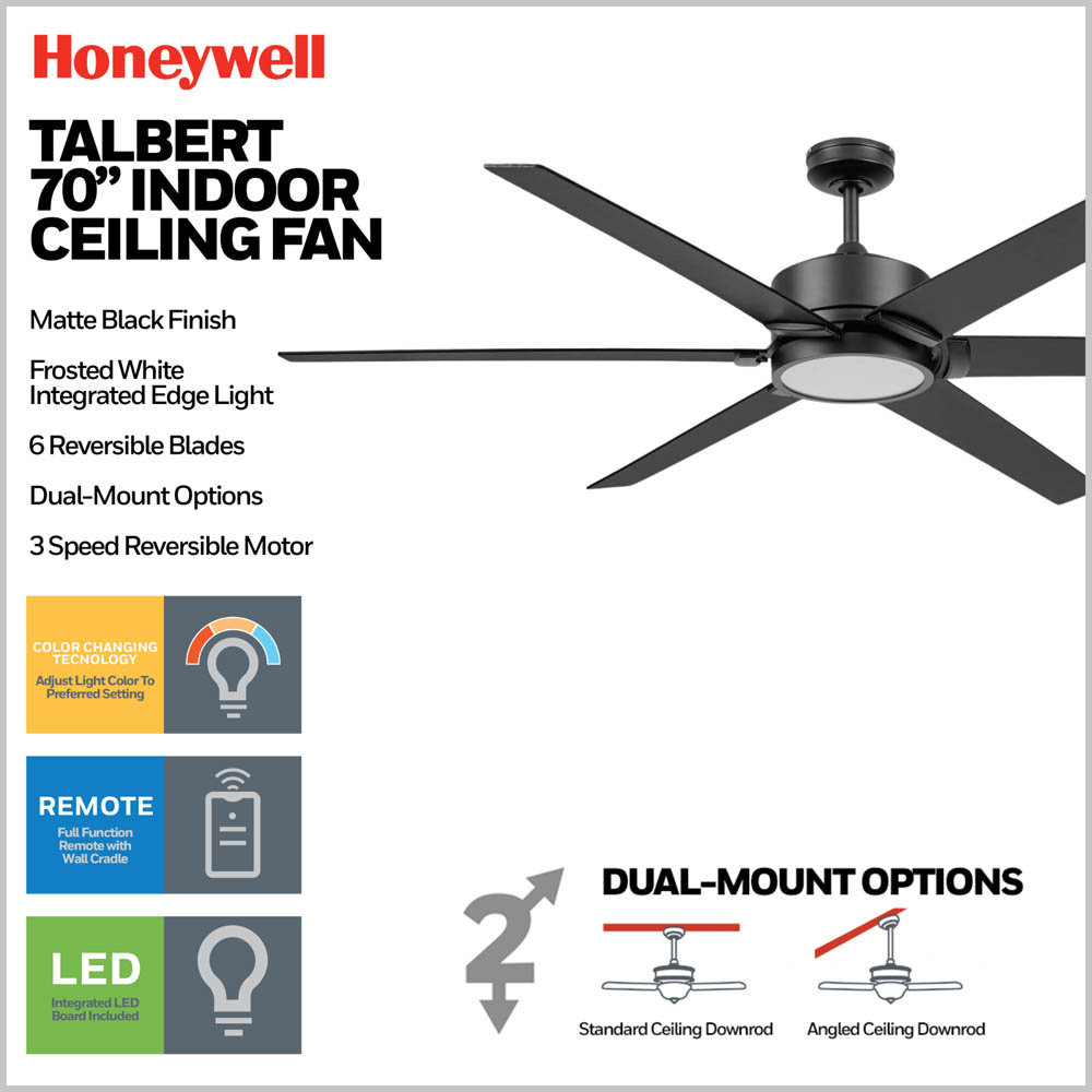 Honeywell Talbert 70 Inch Indoor Matte Black LED Ceiling Fan with Remote Control - 53041