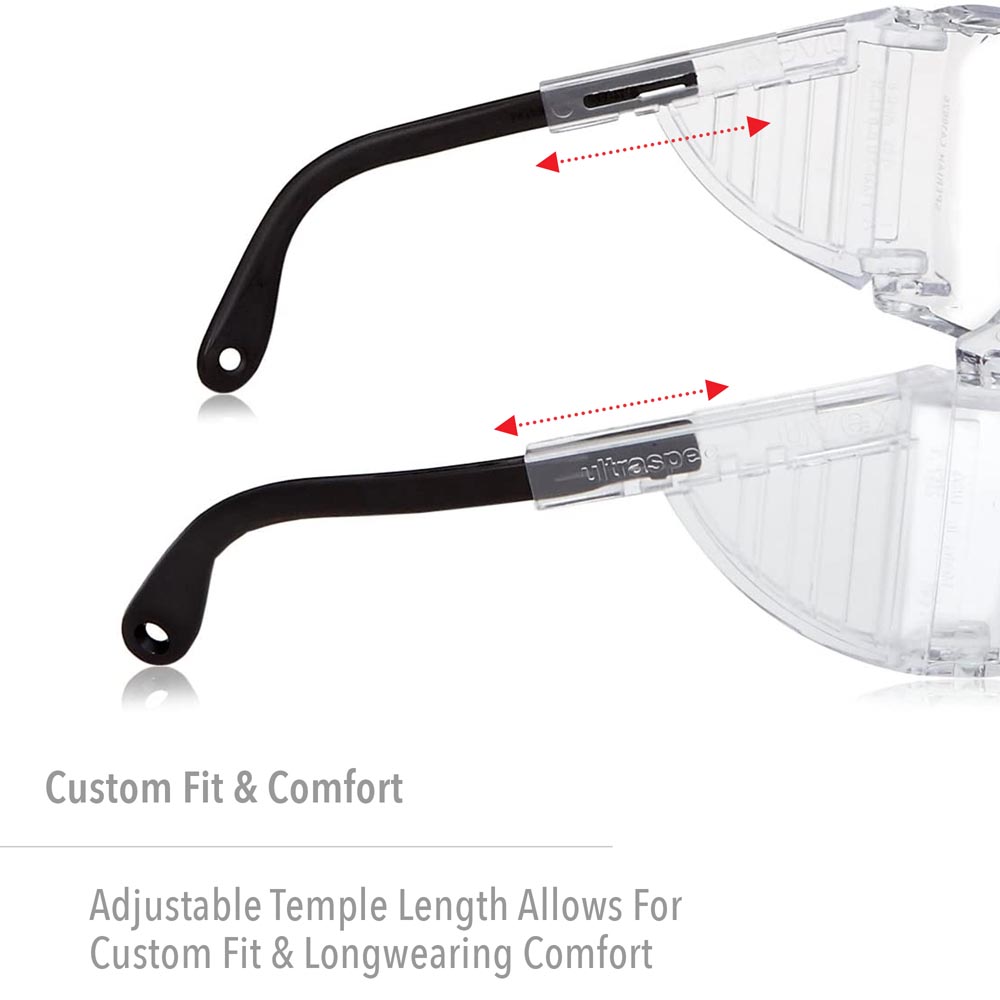 Ultra-Spec 2000 Visitor Specs Safety Glasses are ideal for casual use by office workers entering factory areas, and also for guests during plant visits, factory inspections, tours and other occasions. The model features a wraparound uni-lens design and vented side shields for protection and comfort. The adjustable temple length ensures a comfortable, custom fit through extended wear. The 100% Polycarbonate lens is extremely tough, and the lens coatings are permanently bonded to the lens for long-lasting durability. Two lens coatings are available: Uvextreme anti-fog for performance under hot and humid conditions, and the Ultra-Dura hard coat to protect against scuffing and scratching. Multiple lens tints are also available including clear, amber and gray options for different applications. Tested to meet ANSI Z87.1+ 2015 and CSA Z94.3 standards.