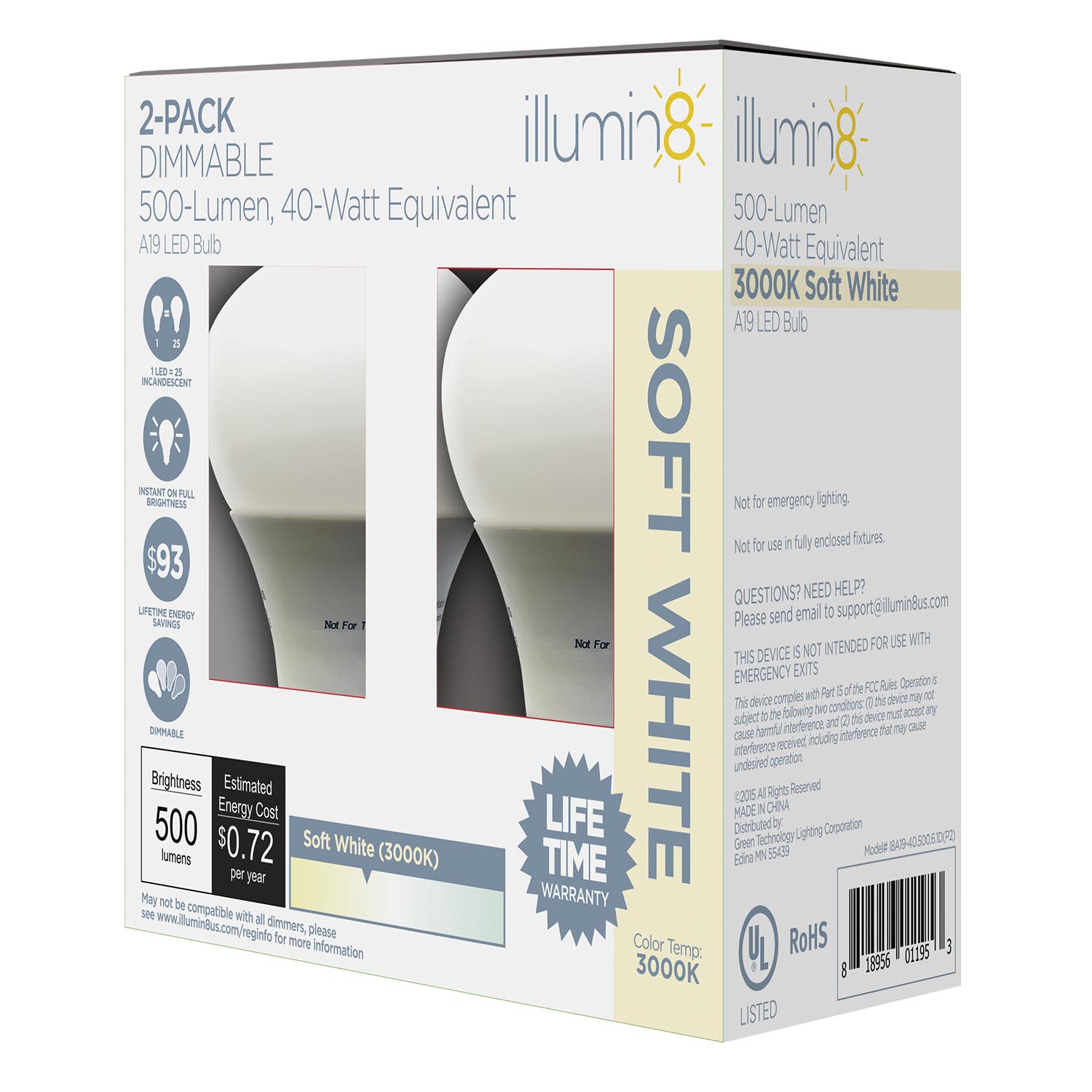 Bundle of Four Illumin8 A19 LED Light Bulb, Dimmable, 7 watt, 3000K (40w Equiv) 2 Packs - I8A19-40.500.7.1D(2PK)