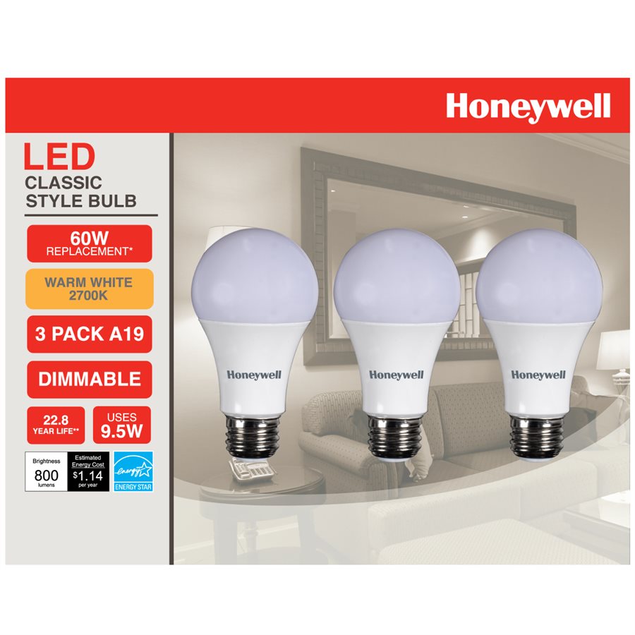 Honeywell A19 LED Light Bulbs, 60W Equivalent Dimmable 3 Pack, A196027HB322