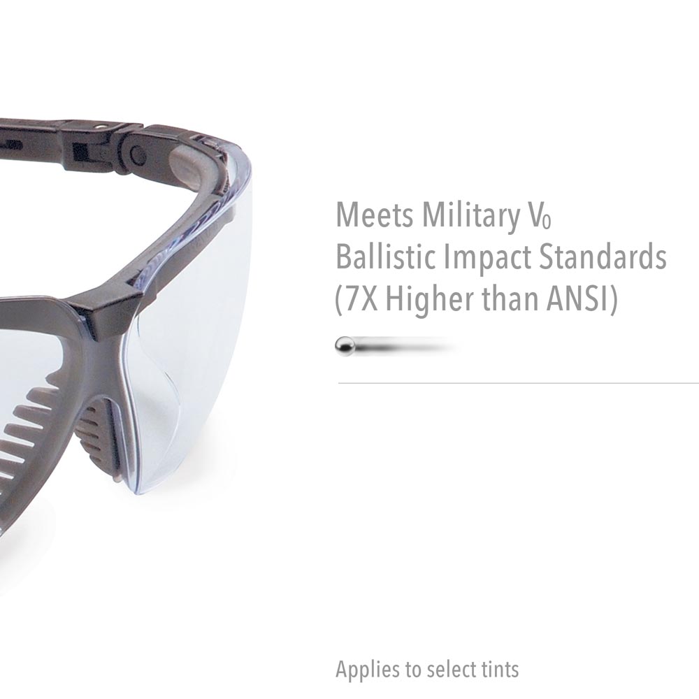 Uvex Genesis Safety Glasses are engineered for comfort, protection and style, Our Genesis line is the number one selling premium protective eyewear in the market, delivering an incredible range of superior product benefits. Built with MMT (Multi-Material Technology), these safety glasses offer the highest available impact safety: military V0 ballistic test protection against impact energies 7X higher than ANSI requirements (on select tints). They are also certified to meet CSA Z94.3 standards. Some models also feature an advanced TPE frame formulation that performs exceptionally well in environments where chemical mist, cutting oils and high moisture are present. The wraparound 9-base uni-lens offers excellent side coverage and peripheral vision, and the adjustable temple length & lens inclination makes for a truly customized fit. Unique comfort features include a soft elastomer browguard to diffuse impacts, and soft, flexible nose fingers that reduce slippage and conform to almost any nasal profile. A ventilation channel between the frame and lens vents the eye socket area to deliver an outstanding level of moisture and fog control. Genesis safety eyewear also boasts an easy and economical lens replacement system to extend the life of your glasses. Uvex Genesis Safety Glasses are available with multiple lens tints to suit almost any work environment. Uvex stands for "Ultra Violet Excluded", which means our safety glasses employ specifically formulated resins that filter 99.9% of the UV radiation in accordance to the U6 scale of the Z87 standard. Uvex has also developed Spectrum Control Technology (SCT), which incorporates unique dyes designed to absorb select wavelengths of radiant energy (light). Our anti-glare glasses, tinted safety glasses and safety sunglasses are designed to manipulate light to reduce a spectral hazard, or to provide distinctive filtration for specific safety eyewear viewing tasks. Examples include filtering solar radiation to reduce glare, and blocking radiation from welding to protect workers around these operations. Multiple anti-fog and anti-scratch coatings are also available. The new HydroShield technology provides our best anti-fog lens coating, keeping your vision clear up to 90X longer than most other competitive anti-fog safety glasses. The Uvextreme anti-fog coating offers great, dual-action performance under demanding hot and humid conditions for long lasting fog-free performance. Our Ultra-Dura hardcoat makes for some of the toughest scratch-resistant safety glasses in the world. Permanently bonded to the lens, it offers unparalleled scratch and chemical resistance. The dual anti-fog/anti-scratch Dura-Streme coating combines the benefits of our industry-leading Uvextreme anti-fog coating and our Ultra-Dura anti-scratch hardcoat. While the advanced anti-fog properties of Uvextreme help keep the interior of the lens clear from fogging, the rugged properties of Ultra-Dura protect the exterior of the lens from scuffs and scratches, adding up to three times more life to lenses.