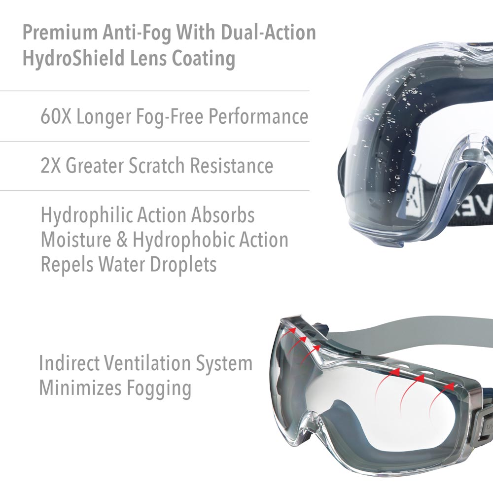 - HYDROSHIELD ANTI-FOG COATING: Premium anti-fog coating permanently bonded to lens for up to 60X longer fog-free performance; dual-action process absorbs moisture AND repels water droplets away; indirect ventilation system further minimizes fogging