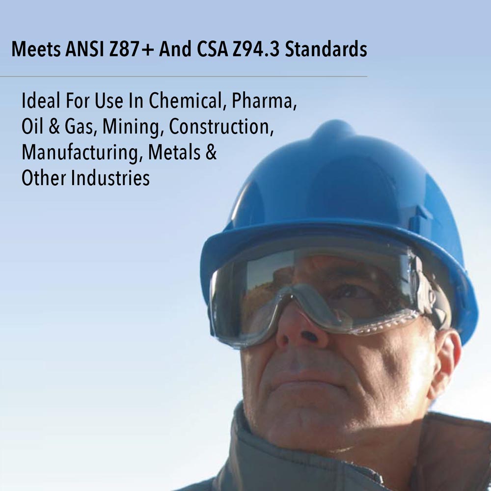 - SPLASH & IMPACT PROTECTION: Gap-free fit protects eyes from splashes, mists, dusts etc; low-profile design reduces chance of snagging; frame and lens are both impact-resistant for workplace safety; meets ANSI Z87+ and CSA Z94.3