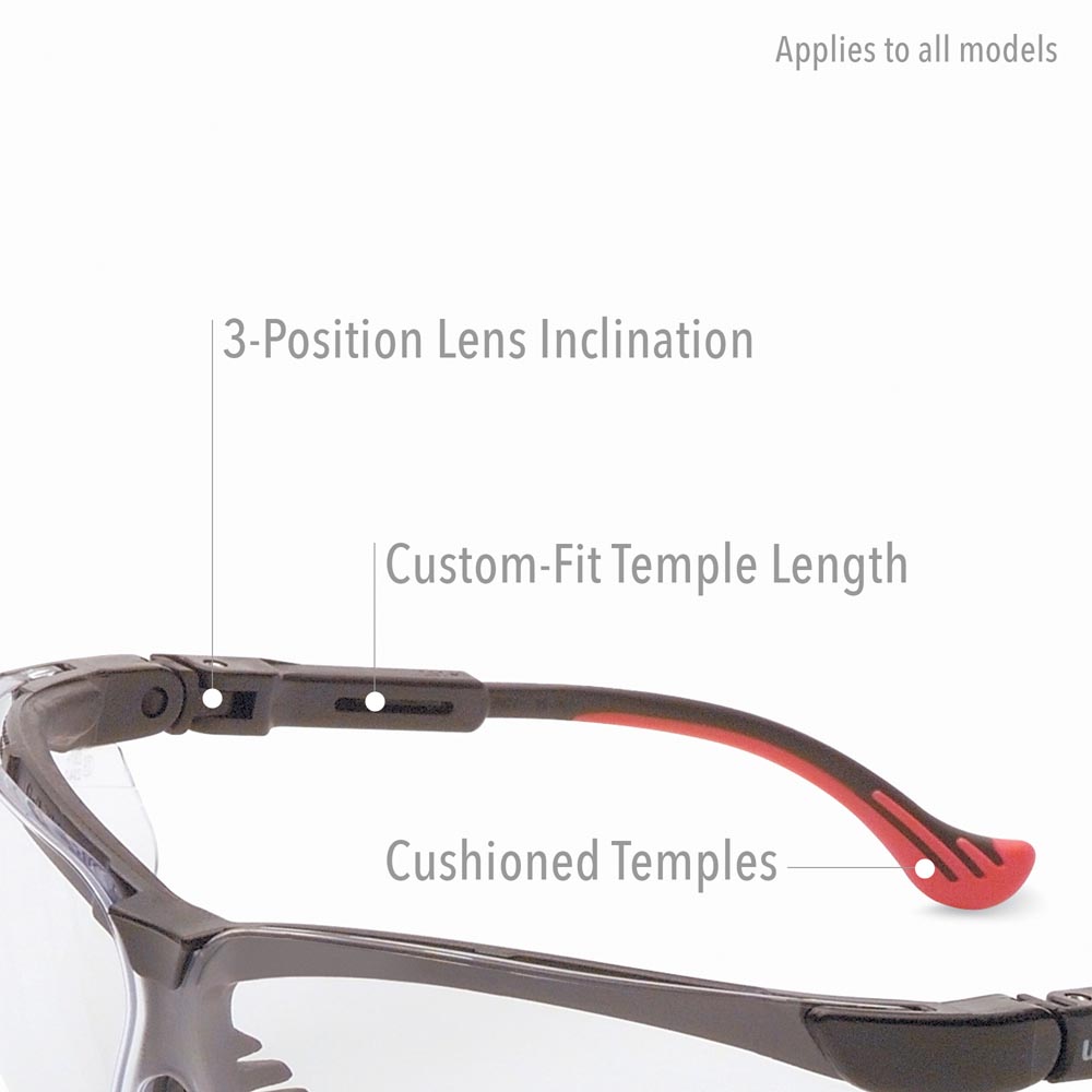 Uvex Genesis XC Safety Glasses offer an economical, all-in-one protective eyewear solution for workers who wear prescription glasses. These glasses have all same comfort and adjustment features as our best-selling Genesis product line, but include an optional Rx lens insert that holds prescription lenses. This effectively turns the Genesis XC model into prescription safety glasses (and if tinted, prescription sunglasses). They can accommodate a wide variety of Rx needs, including bifocals, trifocals and progressive lenses. And the simple screw closure can easily fit prescriptions ranging from +3.0 to -3.0 diopters. The traditional Genesis wraparound design has also been extended by approximately 20% to provide extra protection for prescription lenses (now more than 180° of peripheral coverage). Built with MMT (Multi-Material Technology), these safety glasses offer the highest available impact safety: military V0 ballistic test protection against impact energies 7X higher than ANSI requirements (on select tints). They are also certified to meet CSA Z94.3 standards. Some Genesis XC models also feature an advanced TPE frame formulation that performs exceptionally well in environments where chemical mist, cutting oils and high moisture are present. The three-position lens inclination system and adjustable temple length make for a truly customized fit. The temples are also cushioned for a non-slip fit and all-day comfort. Other unique comfort features include a soft elastomer browguard to diffuse impacts, and soft, flexible nose fingers that reduce slippage and conform to almost any nasal profile. Genesis XC safety eyewear also boasts an easy and economical lens replacement system to extend the life of your glasses. Uvex Genesis XC Safety Glasses are available with multiple lens tints to suit almost any work environment. Uvex stands for "Ultra Violet Excluded", which means our safety glasses employ specifically formulated resins that filter 99.9% of the UV radiation in accordance to the U6 scale of the Z87 standard. Uvex has also developed Spectrum Control Technology (SCT), which incorporates unique dyes designed to absorb select wavelengths of radiant energy (light). Our anti-glare glasses, tinted safety glasses and safety sunglasses are designed to manipulate light to reduce a spectral hazard, or to provide distinctive filtration for specific safety eyewear viewing tasks. Examples include filtering solar radiation to reduce glare, and blocking radiation from welding to protect workers around these operations. Multiple anti-fog and anti-scratch coatings are also available. The new HydroShield technology provides our best anti-fog lens coating, keeping your vision clear up to 90X longer than most other competitive anti-fog safety glasses. The Uvextreme anti-fog coating offers great, dual-action performance under demanding hot and humid conditions for long lasting fog-free performance. Our Ultra-Dura hardcoat makes for some of the toughest scratch-resistant safety glasses in the world. Permanently bonded to the lens, it offers unparalleled scratch and chemical resistance. The dual anti-fog/anti-scratch Dura-Streme coating combines the benefits of our industry-leading Uvextreme anti-fog coating and our Ultra-Dura anti-scratch hardcoat. While the advanced anti-fog properties of Uvextreme help keep the interior of the lens clear from fogging, the rugged properties of Ultra-Dura protect the exterior of the lens from scuffs and scratches, adding up to three times more life to lenses.